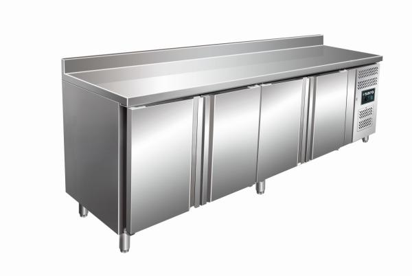 Kühltisch, 4 Türen+Aufkantung Modell SNACK 4200 TN - 323-1830(Art.-Nr.: 011.08.036)Hersteller/Großhändler Saro BTH 2230 x 600 x 890/950 mm -2°C bis 8°C 0,3 kW, 230 V - Material: (Gehäuse und Innenraum) Edelstahl; (Arbeitsfläche) Edelstahl mit Aufkantung (100 mm) - 4 Türen, selbstschließend, mit praktischer Magnetdichtung - 4 höhenverstellbare Roste und Auflageschienensets - Herausziehbarer Kompressor für leichte Reinigung - Digitale Temperaturkontrolle (DIXELL) - Isolierung: 60 mm - Umluftkühlung - Automatische Abtauung - Geeignet für Klimaklasse 4, 5 - Roste: 4x B 335 x T 430 mm - Inhalt (brutto/netto): 511 / 312 Liter - Innenmaße: B 1669 x T 430 x H 564 mm - 6 höhenverstellbare Füße - Gewicht (netto/brutto): 159 / 189 kg - Kältemittel: R600a - Energieeffizienzklasse: D (Spektrum A+++ bis G) bei Klimaklasse 5 -> Hochleistungsgerät! | |